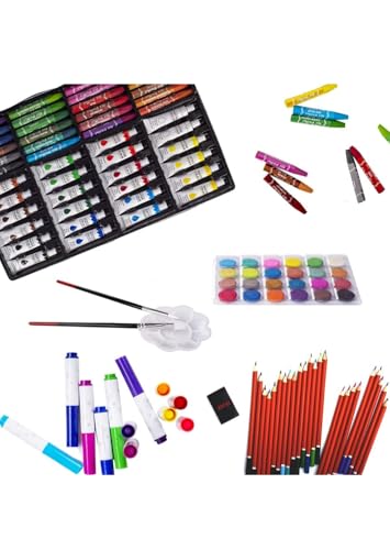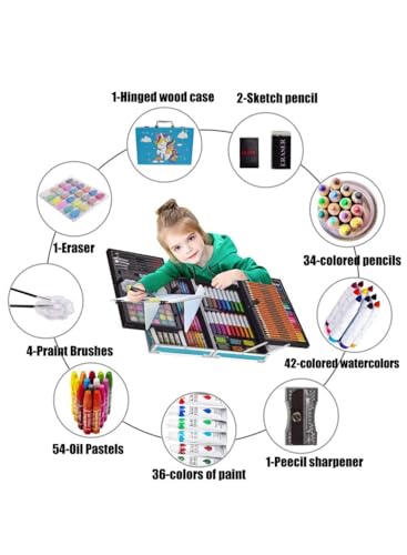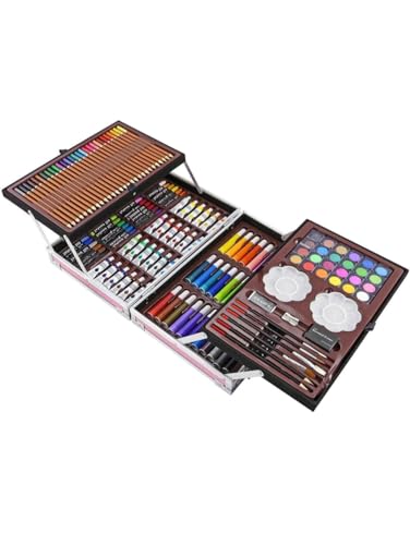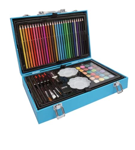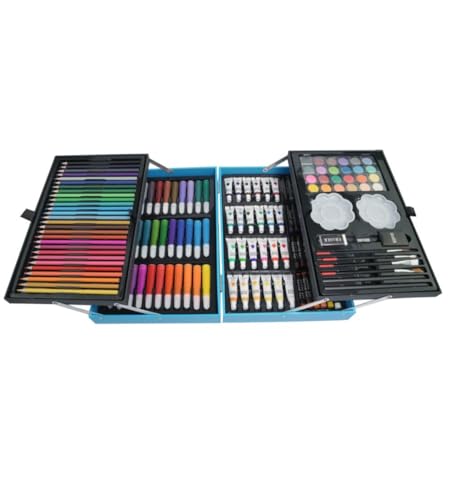 - محتويات المجموعة: تحتوي على 168 قطعة فنية متنوعة تشمل الألوان المائية والأقلام الملونة وأقلام الباستيل