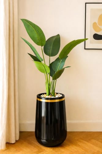 Generic - شجرة موز اصطناعية مع أصيص فايبر جلاس مقاوم للكسر، نبات زينة داخلي بأوراق خضراء، تصميم عصري أسود مع شريط ذهبية