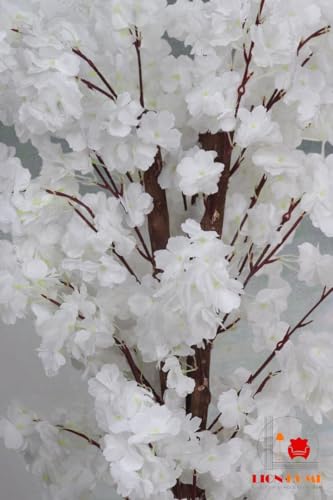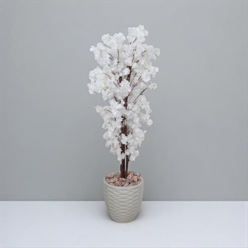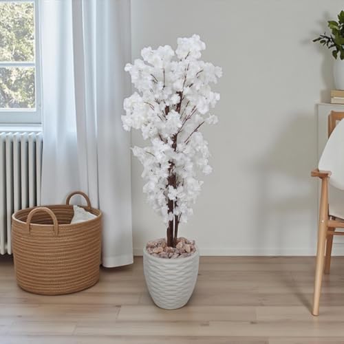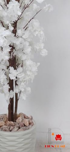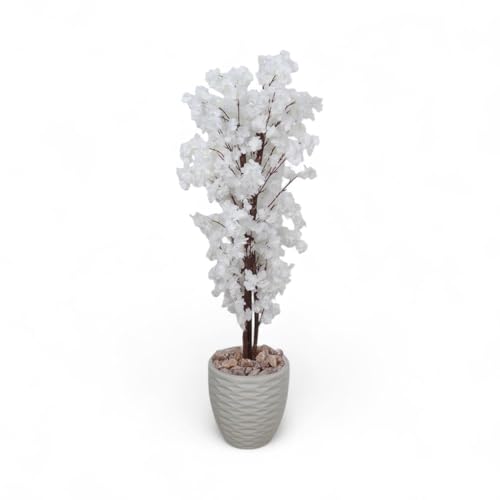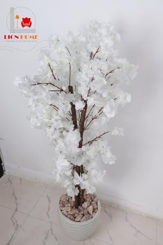 Lion Home - نبات الياسمين الاصطناعي من ليون هوم، بطول 150 سم، بتصميم كثيف ثلاثي الجذوع، شجرة صناعية واقعية للاستخدام الداخلي والخارجي، مع وعاء بلاستيكي وحصى واوراق خضراء. ابيض