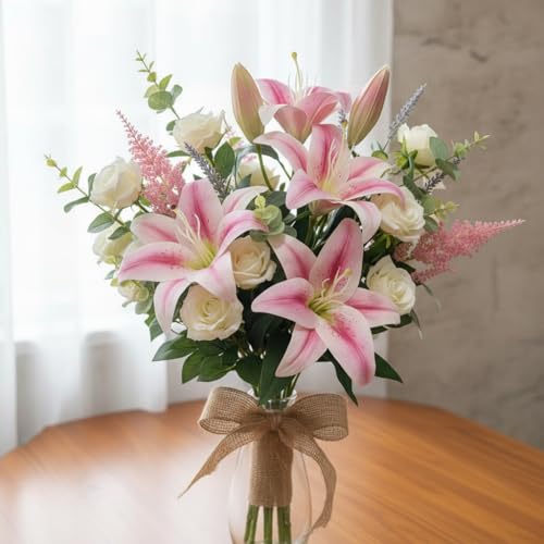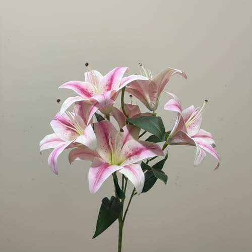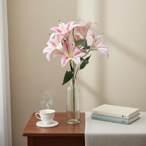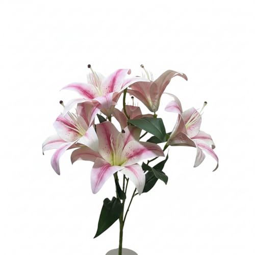 Generic - باقة زهور زنبق صناعي (ليلي) وردي/أبيض – 6 وردات بطول 45 سم – ورد ديكور واقعي للمنزل والمكتب – مناسب للفازات والهدايا والمناسبات