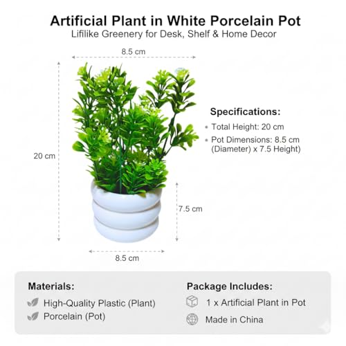 - مقاس مثالي: الارتفاع الإجمالي 20 سم مع أبعاد الأصيص بقطر 8.5 سم × ارتفاع 7.5 سم، مثالي للمكاتب والأرفف والمساحات الصغيرة.