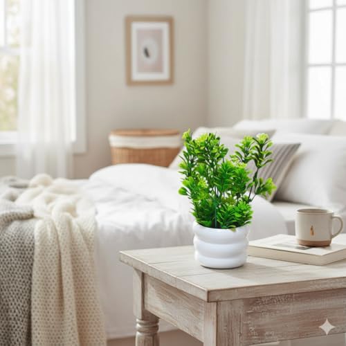 - خامات ممتازة: مصنوع من نباتات بلاستيكية عالية الجودة وأصيص بورسلين أبيض متين بتصميم عصري مضلع.