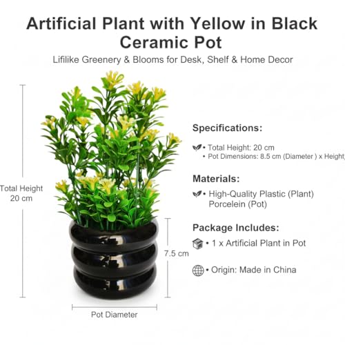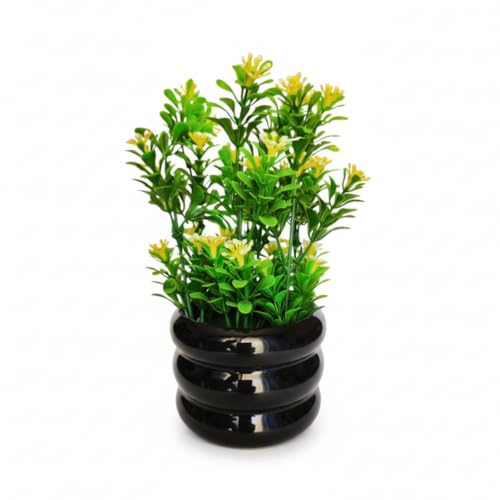 Generic - نبات صناعي مع زهور صفراء في وعاء سيراميك اسود | نبات صناعي نابض بالحياة للمكتب والرف والحمام وديكور المنزل الحديث | لمسة زهور لا تحتاج الى صيانة