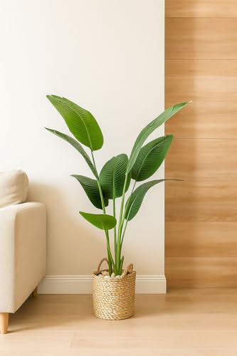 Generic - نباتات صناعية للديكور المنزلي، نبات استوائي بأوراق خضراء كبيرة مع سلة من القش المنسوج