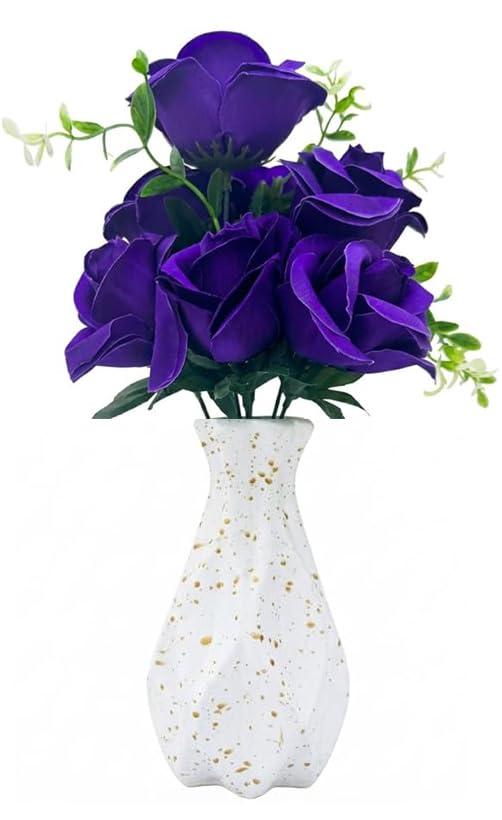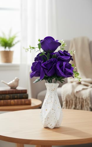 - تصميم أنيق: باقة ورود صناعية بنفسجية جميلة مع أوراق خضراء طبيعية المظهر لإضافة لمسة جمالية راقية