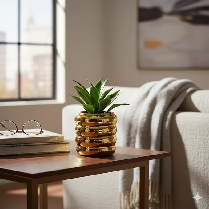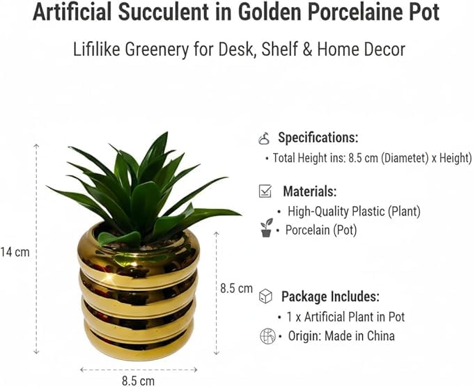 Generic - نبات عصاري صناعي في وعاء بورسلين ذهبي | نبات صناعي صغير للمكتب الحديث والرف وديكور المنزل | نبات عصاري نابض بالحياة مع وعاء ذهبي انيق، صيانة منخفضة