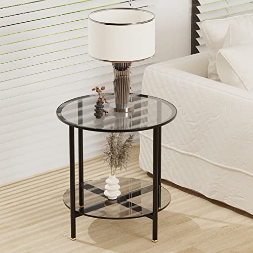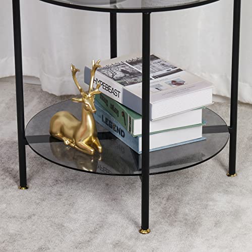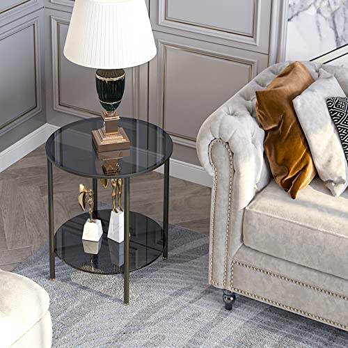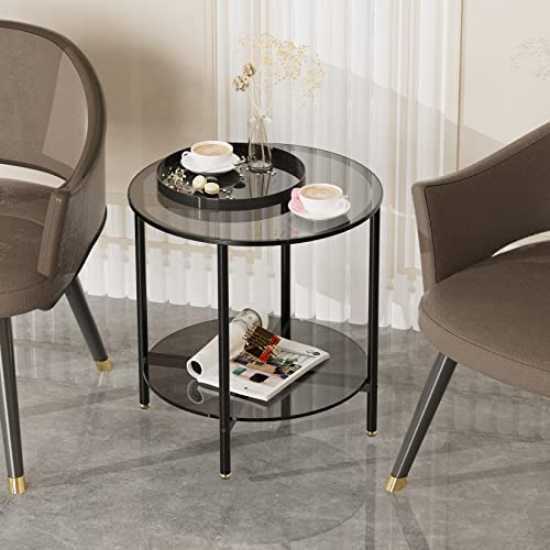 Artloge - ترابيزة جانبية زجاجية دائرية صغيرة: ترابيزات عصرية من طبقتين بقطر دائري 50 سم رفيعة الزجاج المقوى الملون بالرمادي مع شنبر معدني أسود لتزيين أثاث المنزل والمكتب معدن زجاج
