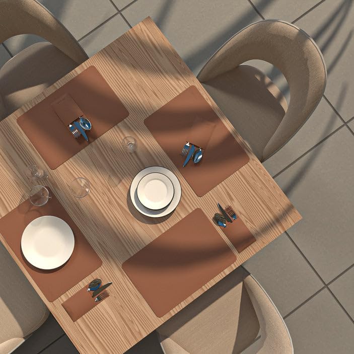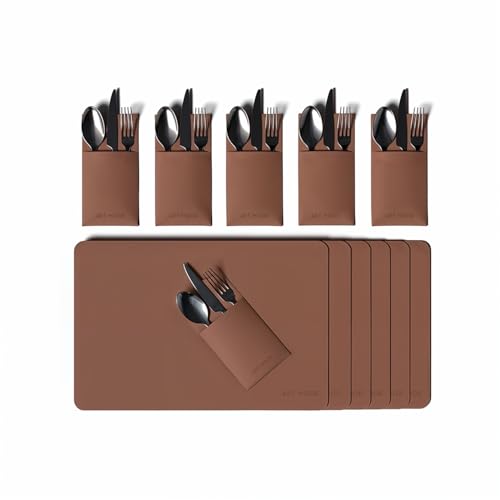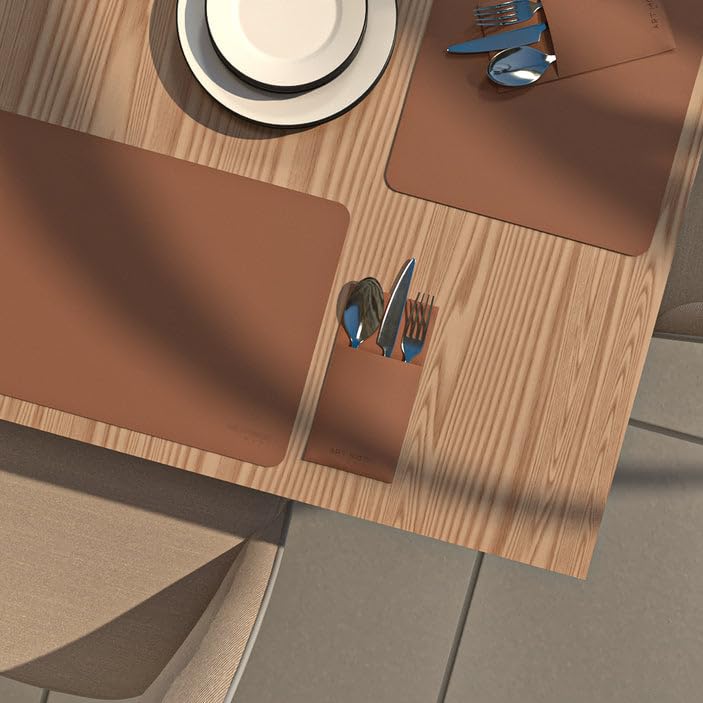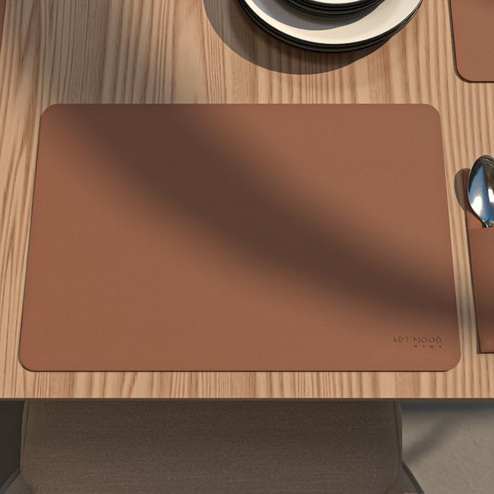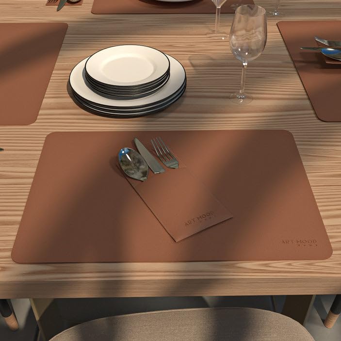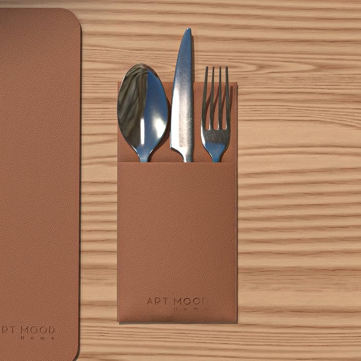 ART MOOD HOME - طقم مفارش للطاولة من الجلد وغطاء حامل لأدوات الطعام - مقاوم للحرارة والماء، غير قابل للانزلاق، سهل التنظيف، بني هافان - 6 مفارش + 6 حامل أدوات المائدة - 13 قطعة، من ارت مود هوم