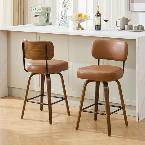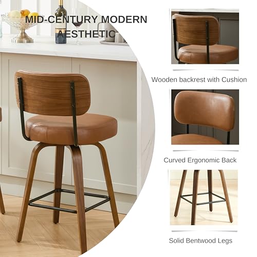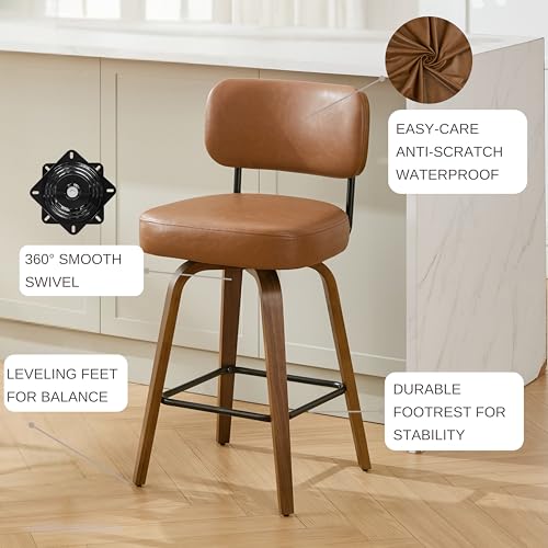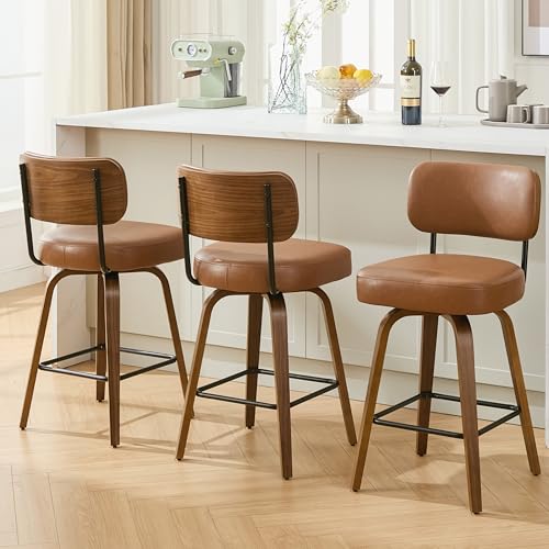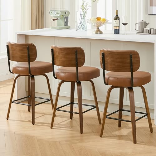 Arvasslia - مجموعة مقاعد بار دوارة من ارفاسليا مكونة من 3 قطع، مقاعد بار منجدة بارتفاع 26 انش مع ارجل خلفية وخشب الجوز، مقاعد بار من الجلد الصناعي لطاولة المطبخ، بني