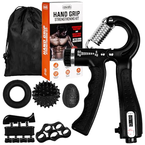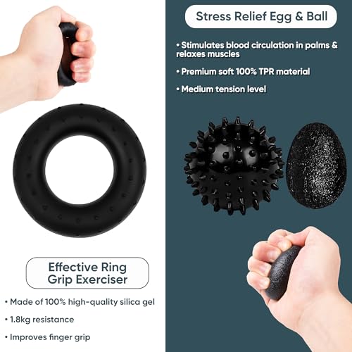 ASAB - أداة تمارين اليد والساعد بتصميم غير قابل للانزلاق مع حلقة لتخفيف التوتر وبيضة وكرة لتقوية المعصم والأصابع والعضلات وتمارين اللياقة البدنية مع شنطة تخزين من ايه اس ايه بي، عبوة من 6 قطع