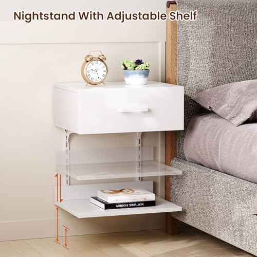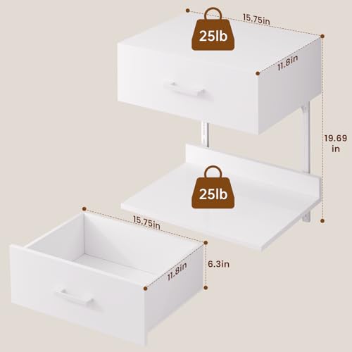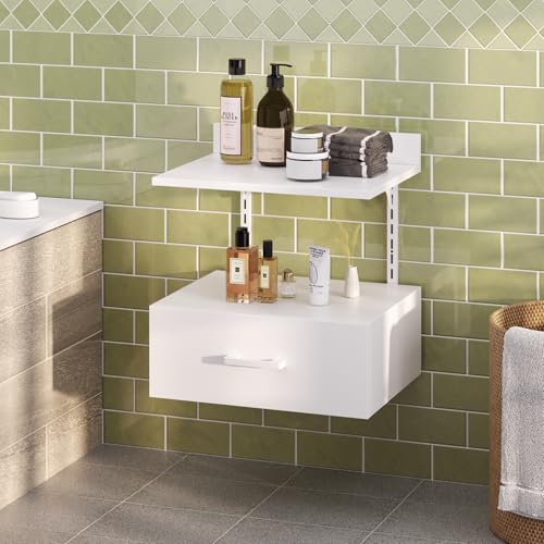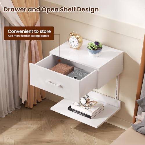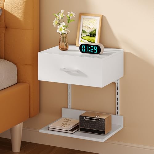 Asgolion - منضدة عائمة مع درج ورف قابلين للتعديل من اسجوليون، طاولة بجانب السرير تثبت على الحائط للمساحات الصغيرة، طاولة جانبية عصرية لغرفة النوم والحمام والمدخل والمكتب المنزلي، ابيض