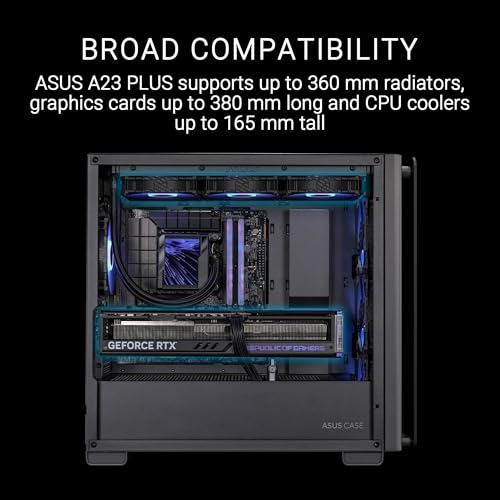 ASUS - كيسة كمبيوتر A23 بلس تي جي إضاءة فضاء لوني ايه ار جي بي ميكرو ايه تي اكس بمراوح مُثبتة، واجهة أمامية شبكية، متوافقة مع اللوحات الأم ذات المنافذ المخفية، مبردات حتى 360 ملم بطاقات رسومية 380 ملم من