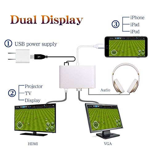 - عرض عالي الدقة HD 1080P: يدعم محول اتداراز لايتنينج إلى HDMI/VGA/VA/الصوت عكس أي شيء موجود على جهاز آيفون/ اي باد الخاص بك إلى التلفزيون/ شاشة العرض/ الشاشة/ الشاشة مع تجربة HD 1080P، بما في ذلك الأفلام/ الألعاب/ الصور/ مكالمات الفيديو/ PPT. يمكنه أيضًا دعم سماعة الأذن/ مكبر الصوت.