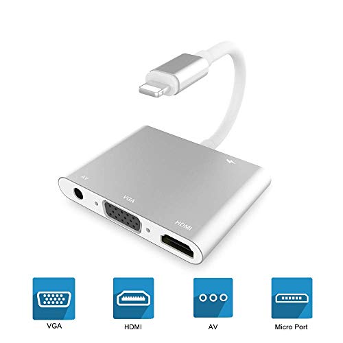 - متعدد الاستخدامات: محول منفذ صوت 4 في 1 لايتنينج إلى HDMI/VGA/AV/3.5 ملم. متوافق مع الأجهزة (مثل التلفزيون وجهاز العرض والشاشة) التي تأتي مع منفذ صوت HDMI/VGA/AV/3.5 ملم، يدعم كل من إخراج الصوت والفيديو أو شاشة HDMI وVGA في نفس الوقت.
