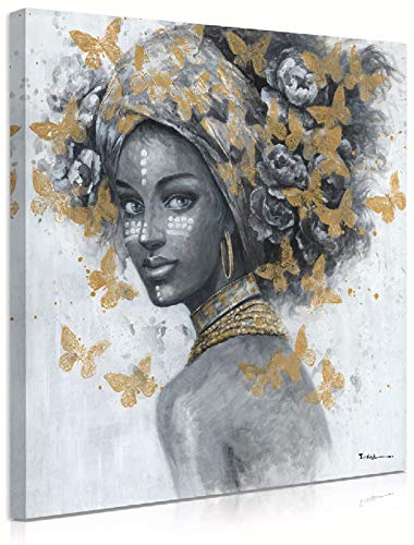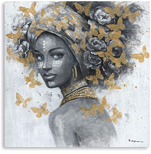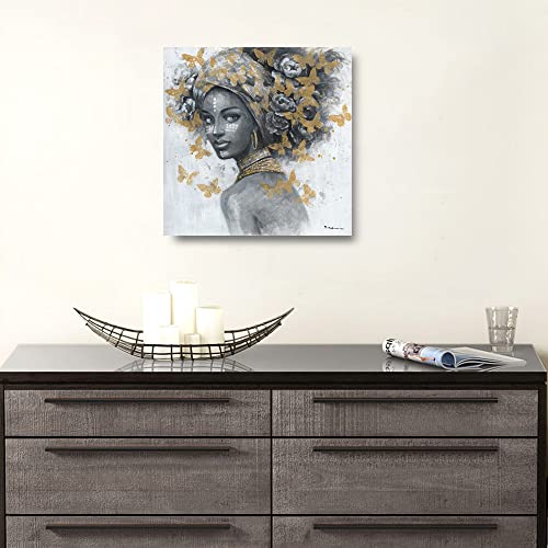 ATELIYISHU - لوحة فنية جدارية للنساء بتصميم امرأة سمراء، لوحة فنية أمريكية قماشية لغرفة النوم بتصميم صورة امرأة سمراء ترتدي حلقان، صورة بورتريه بنمط فراشة ذهبية سوداء وبيضاء من اتيليشو، مقاس 30 × 30 سم
