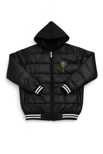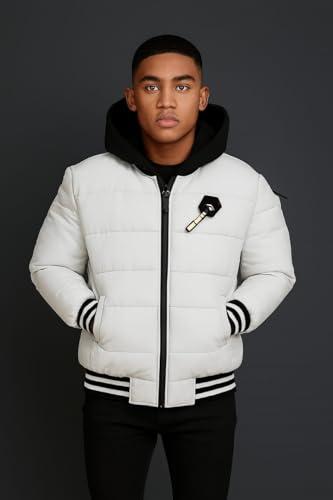 Perfect Fashion - جاكيت رياضي مبطن، معطف شتوي بغطاء للرأس وسوستة أمامية، أبيض بحواف سوداء