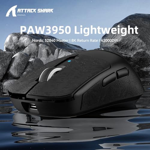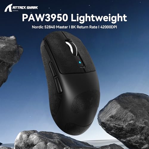 ATTACK SHARK - ماوس العاب لاسلكي شارك R6 بـ3 اوضاع من اتاك، ماوس بلوتوث مريح وخفيف للغاية 38G مع مستشعر PAW3950MAX 42000 نقطة لكل انش، عمر بطارية طويل، سرعة تسارع 50G،اللابتوب/ماك - اسود وشريط لاصق