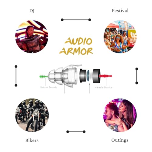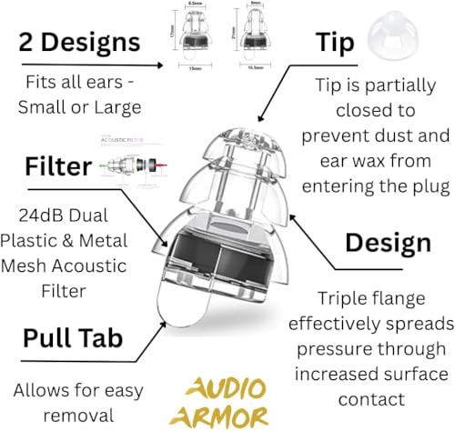- تجربة صوتية محسنة - تمتص تقنية الفلتر الصوتي المضبوطة الصوت وتكرره بدقة لحماية السمع عالية الدقة أثناء الاستمتاع بالموسيقى أو في البيئات الصاخبة.