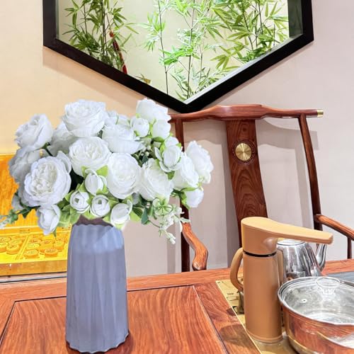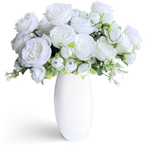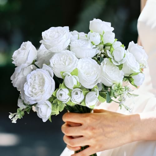 Aufisi - اوفيسي باقة زهور الفاوانيا الاصطناعية، 30 سم، 5 حزم من الزهور الصناعية، الفاوانيا الحريرية، باقة زهور صناعية لتزيين حفلات الزفاف، ابيض