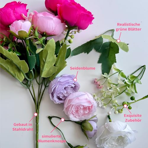 - الحجم والتغليف: 5 حزم من الفاوانيا مع 25 ساق مرنة، تحتوي على 5 زهور كبيرة، 4 زهور صغيرة وتوت في كل مجموعة. الارتفاع الإجمالي: تقريبًا 30 سم. المزهرية غير متضمنة.