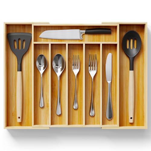 AUJEN - منظم ادراج للاواني من الخيزران قابل للتوسيع | صندوق تخزين ادوات المائدة الخشبي الفاخر لتنظيم المطبخ الأنيق
