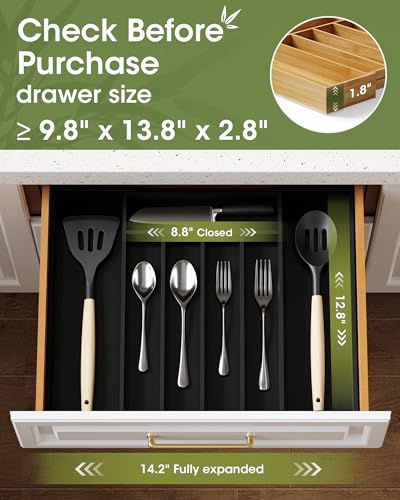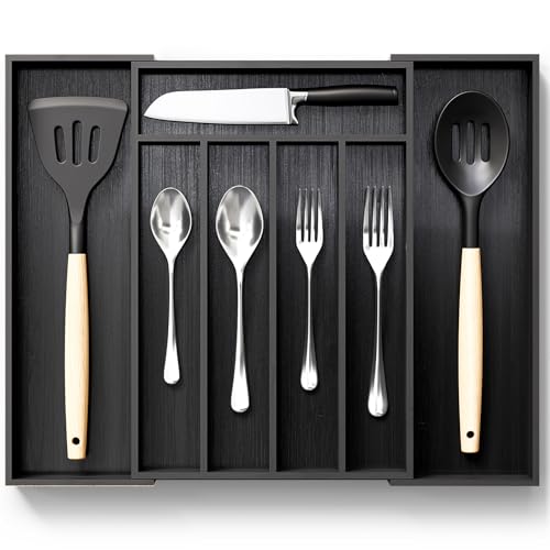 Aujen - اوجين منظم ادراج عصري بسيط من الخيزران، منظم ادوات مائدة قابل للتوسيع، 7 اقسام، اسود