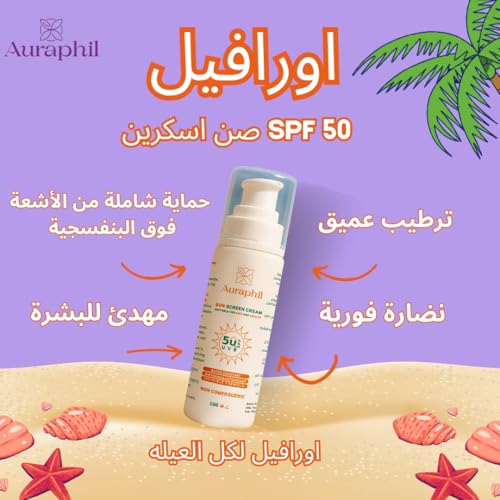Generic - Auraphil اورافيل كريم واقٍ من الشمس SPF 50+ PA ++ للوجه والجسم – تقنية “الدرع الثلاثي”+ فيتامينات E و A و H ومركّب استعادة البشرة – مقاوم للماء – آمن للأطفال ولجميع أفراد العائلة – 100 مل