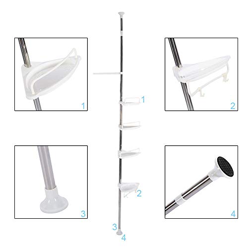 - [سهل التركيب] رف زاوية حمام تلسكوبي تحتاج إلى ثقب أو أداة! تتضمن العبوة تعليمات التركيب والتشغيل لإعداد خالٍ من المتاعب. ببساطة اضبط القضيب ليناسب ارتفاع السقف وابدأ في تنظيم حمامك على الفور.