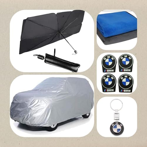 Auto MYK - مجموعة هدايا مستلزمات السيارة مكونة من غطاء مقاوم للماء، شماسة لزجاج مقدمة السيارة، سلسلة مفاتيح تحمل العلامة التجارية، فوطتين من المايكروفايبر، سدادة إنذار لحزام الأمان، شنطة بحبل من اوتو ام واي كيه