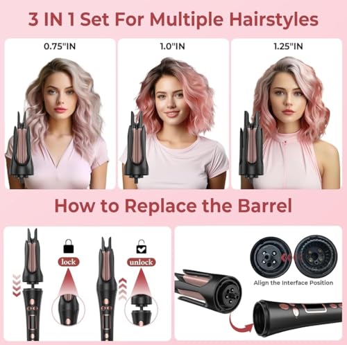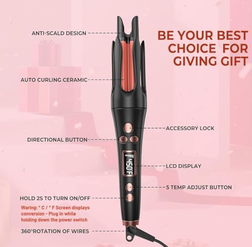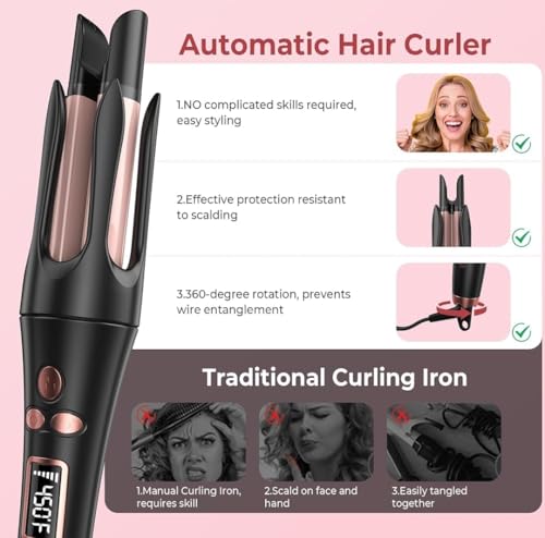- تصميم متعدد الاستخدامات: مكواة شعر أوتوماتيك دوارة مع 2 رؤوس قابلة للتبديل بمقاسين 19 ملم و25 ملم لإنشاء تموجات وتجاعيد مختلفة حسب رغبتك