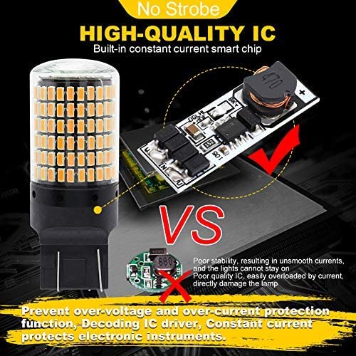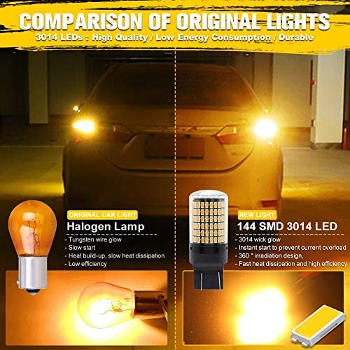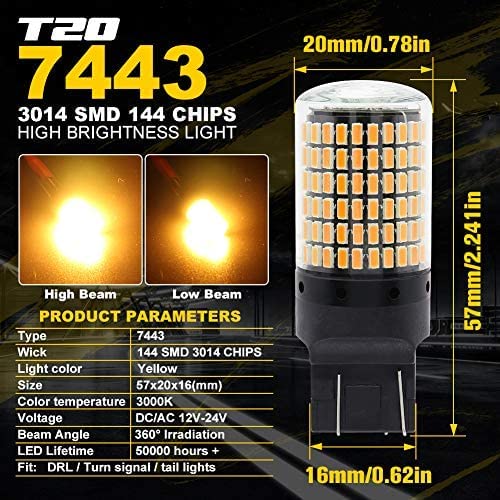 Automaze - مصباح كانباص مزدوج الوصلات والسنون خالي من الأخطاء 15 وات 144 ليد / اس ام دي للفرامل 12 فولت 7443 7440 T20 من اوتوميز، لمبات فانوس خلفية كهربائية، كهرماني/أصفر