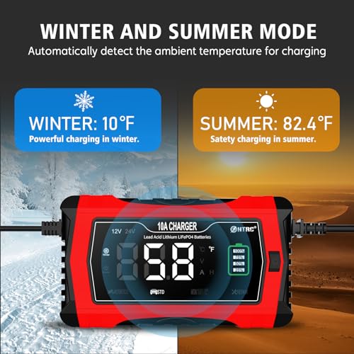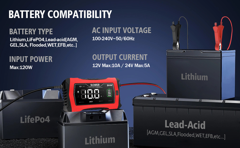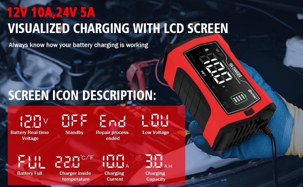 - أداء قوي: يوفر هذا الشاحن الأوتوماتيكي بالكامل 10 أمبير شحنًا دقيقًا لبطاريات الرصاص الحمضية 12 فولت و24 فولت وبطاريات ايه جي ام والجيل والليثيوم وغيرها من بطاريات السيارات/البحرية.