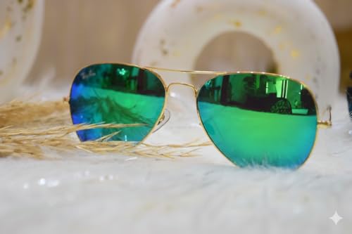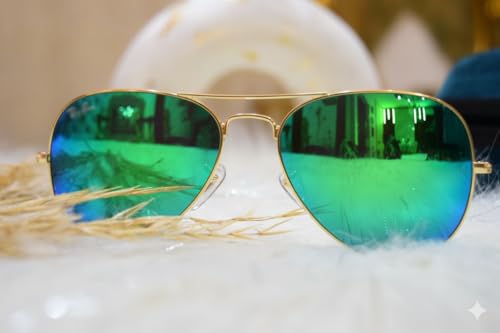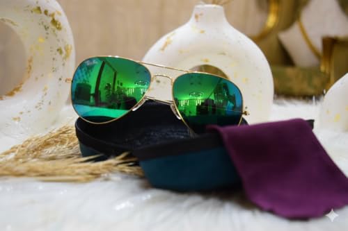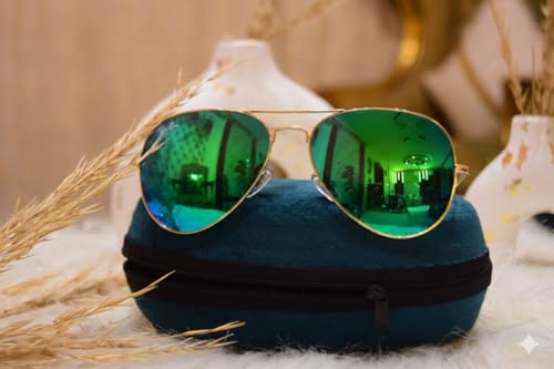 Generic - نظارات شمسية أفياتور بإطار ذهبي وعدسات خضراء عاكسة، مع حافظة ومنديل تنظيف