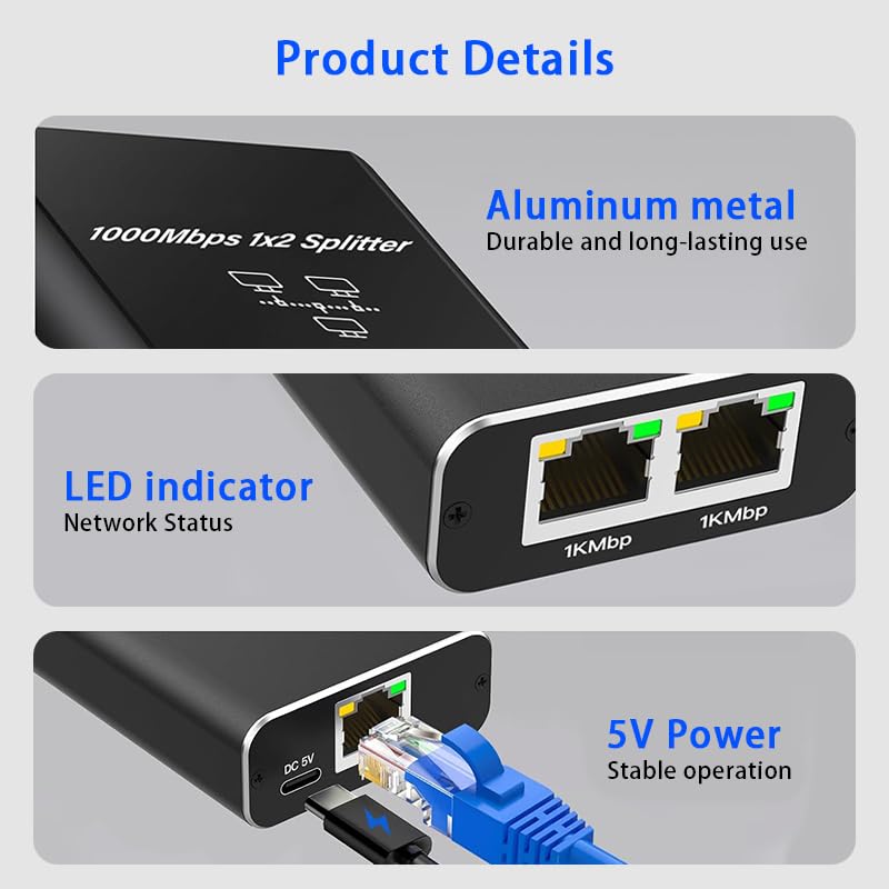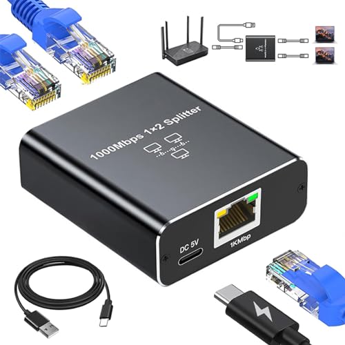 Avigers - موزع إيثرنت 1 إلى 2 مع مبدل شبكة جيجابت إيثرنت، موزع إنترنت ار جيه 45 1000 ميجابت/ثانية مع كابل طاقة USB نوع سي للكمبيوتر والموزع والمبدلات والرواتر والايه دي اس ال والتلفزيون الرقمي وغيرها من افيجرز