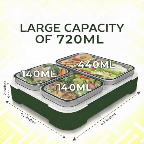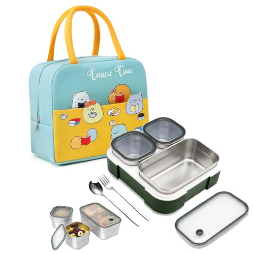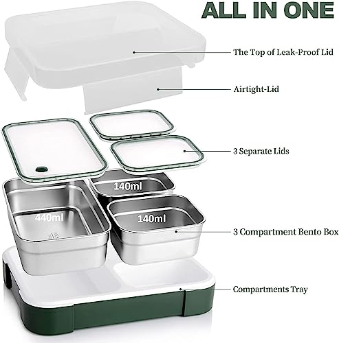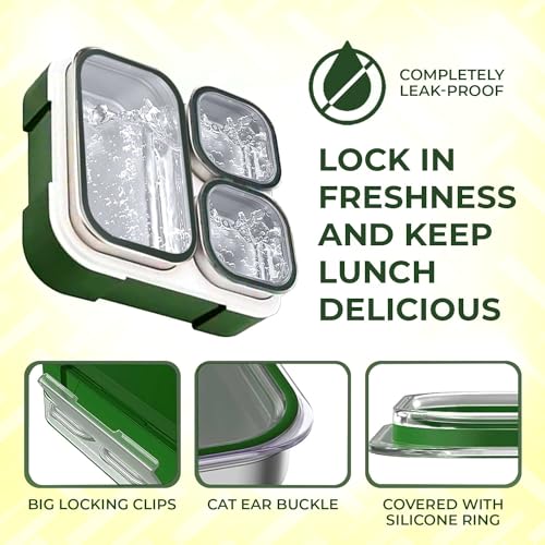 Avrini - لانش بوكس بينتو معزول من الفولاذ المقاوم للصدأ مع أدوات مائدة وشنطة من افريني، مكون من 3 أقسام مع أغطية، 720 مل (أخضر)