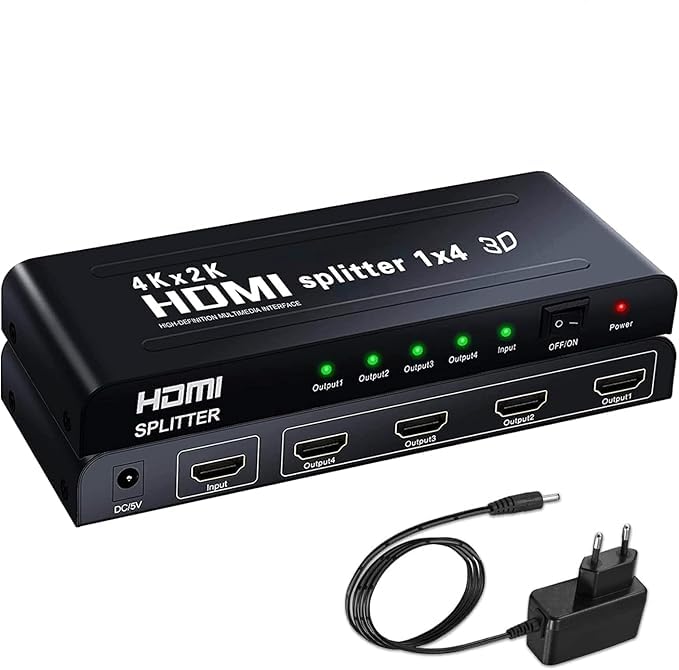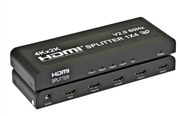 - موزع HDMI بمدخل واحد وأربعة منافذ إخراج: تقسيم إشارة إدخال HDMI واحدة إلى ما يصل إلى أربعة إشارات إخراج HDMI متطابقة مع إشارة الإدخال - المدخل: 1 × HDMI ومنافذ إخراج: 4 × HDMI.