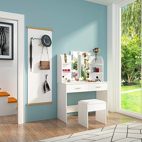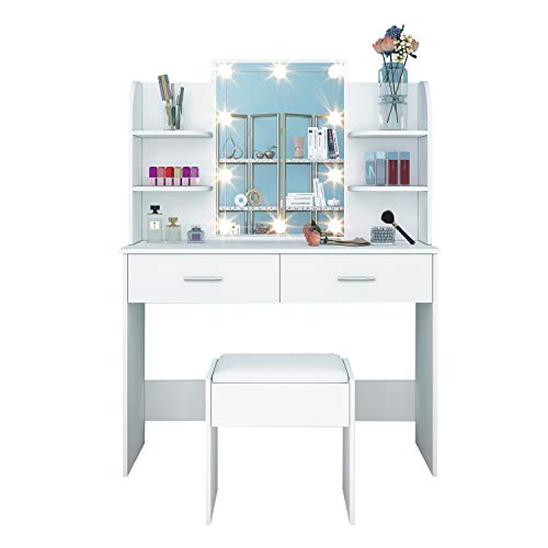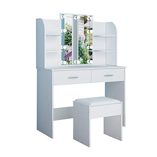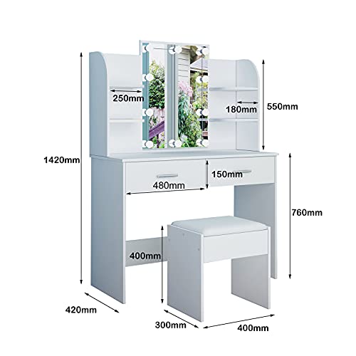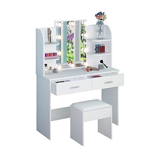 AWOOOD - تسريحة فانيتي مع أضواء ومراية و2 درج كبير ومقعد للبنات من اوود، أبيض