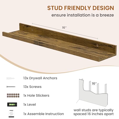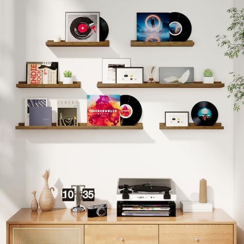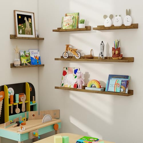 Axeman - رف ليدج للصور، أرفف عائمة لديكور الحائط طقم من 6 قطع، أرفف عائمة مثبتة على الحائط مقاس 60.96 سم، أرفف حائط بحافة لغرفة المعيشة وغرفة النوم والحضانة والحمام والمطبخ، بني ريفي من اكسمان