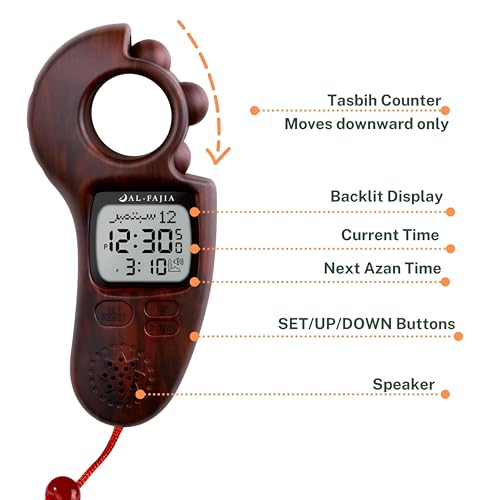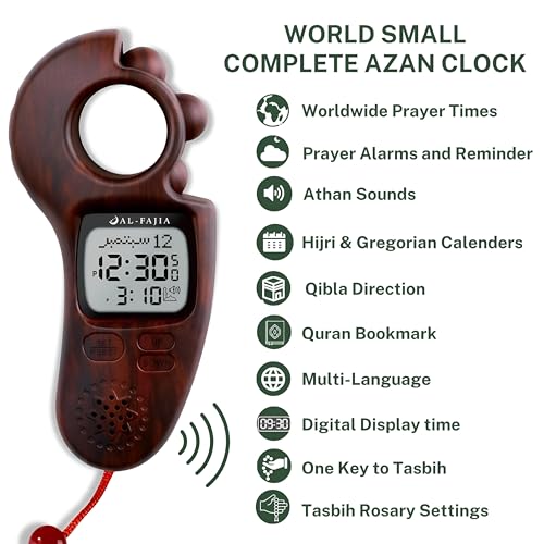 Generic - ساعة منبه للاذان - عداد تسبيح رقمي مع دعم متعدد اللغات، اكثر من 6000 جدول صلاة للمدينة، تقويم هجري ميلادي، بوصلة قبلة، أناقة خشب الورد
