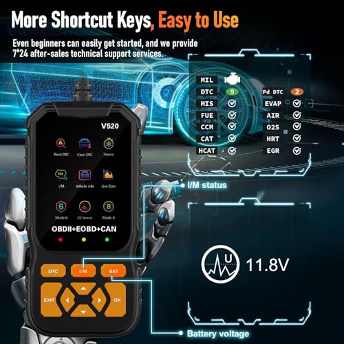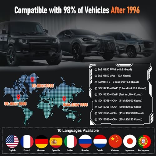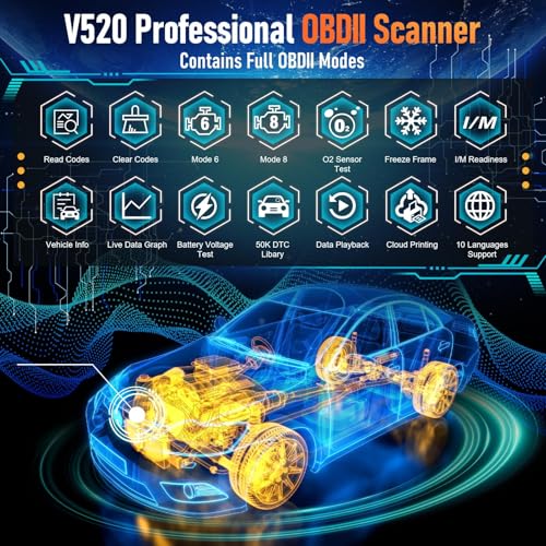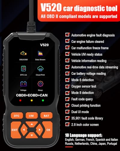 - 📱 【توافق واسع ودعم لغات متعددة】 - يعمل جهاز V520 عالميًا مع أي سيارة بعد عام 1996 ويوفر عشرة خيارات للغات، بما في ذلك الإنجليزية والإسبانية والألمانية وأكثر من ذلك (اللغة العربية غير مضمونة)، مع أوضاع واجهة مستخدم مزدوجة لسهولة الرؤية في ظروف الإضاءة المختلفة.