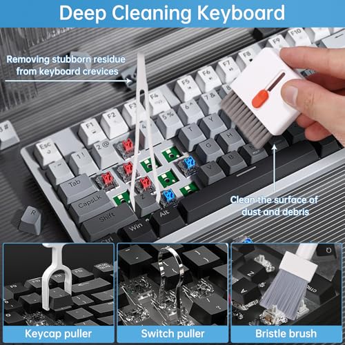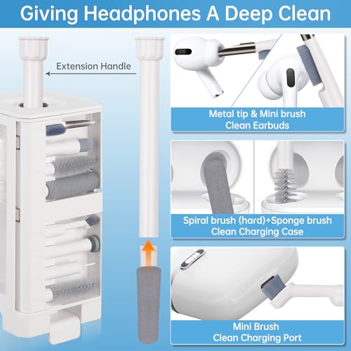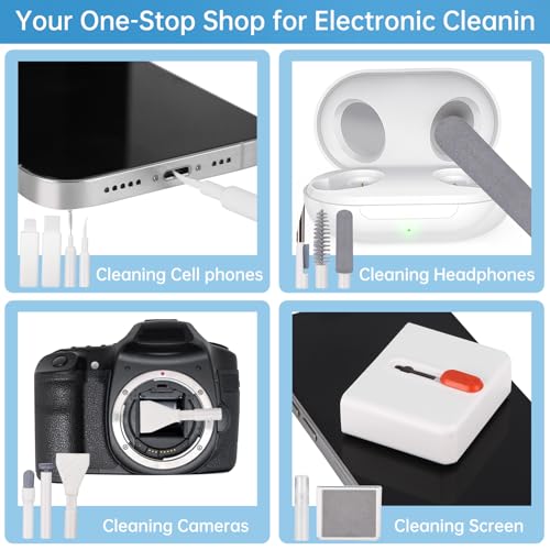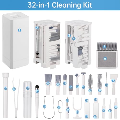- طقم تنظيف 32 في 1: يحتوي الطقم على مجموعة متنوعة من الأدوات لتلبية مختلف احتياجات تنظيف الأجهزة الإلكترونية، مثل قلم تنظيف منافذ شحن الهاتف المحمول، وفرشاة لوحة المفاتيح، ومنظف الشاشة، وقلم تنظيف سماعات الأذن وغيرها، مما يوفّر تغطية شاملة لاحتياجات تنظيف الهواتف المحمولة، وسماعات الأذن ولوحات المفاتيح وأجهزة اللابتوب.