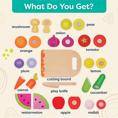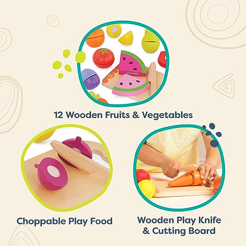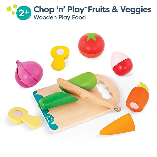 B. toys - مجموعة طعام للعب التظاهري من بي تويز - 12 فاكهة وخضروات خشبية للتقطيع - طعام لعب قابل للتقطيع للأطفال الصغار - سكين لعب ولوح تقطيع - لعمر عامين فما فوق - اقطع والعب - الفواكه والخضروات