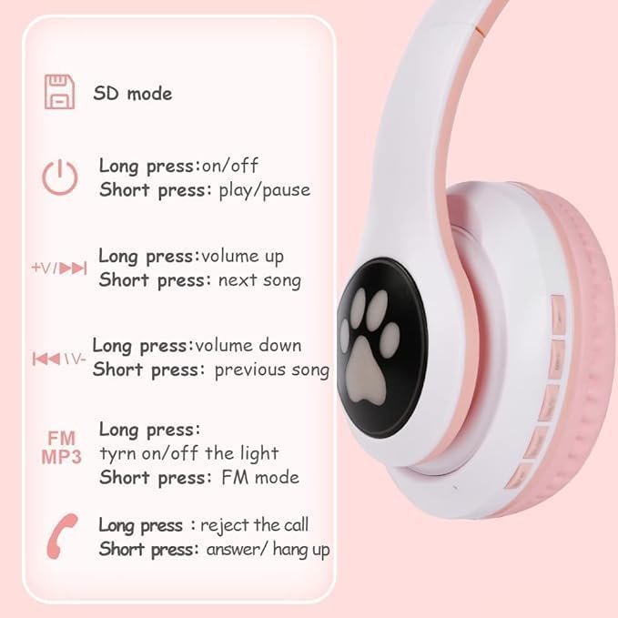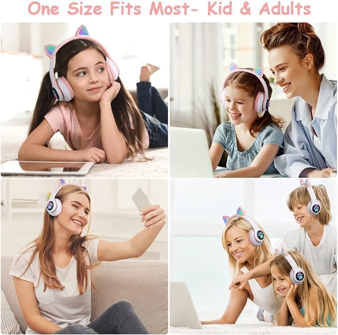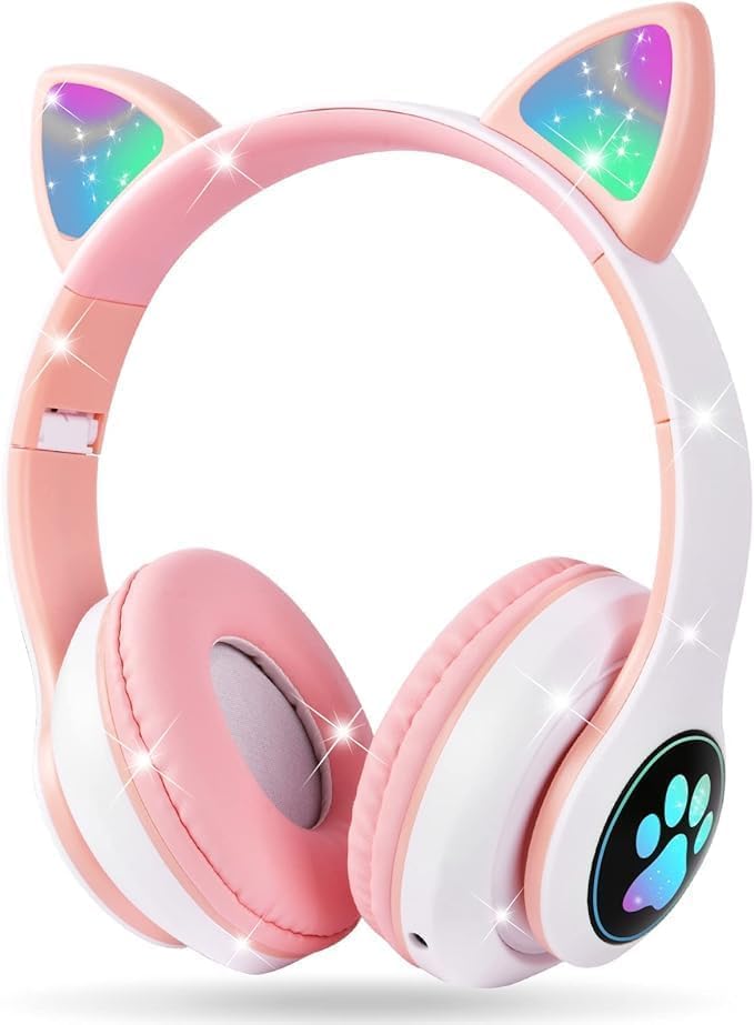 - تصميم مميز: سماعات رأس لاسلكية بتصميم أذني قطة مع إضاءة LED متعددة الألوان، مثالية للأطفال بمظهرها الجذاب