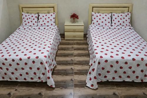 Generic - طقم ملايات أطفال قطن عامرية مسطحة بدون استك، نقشة فراولة، سريرين، 6 قطع، يشمل 2 ملاية و2 مخدة و2 خدادية