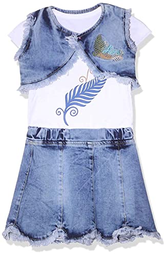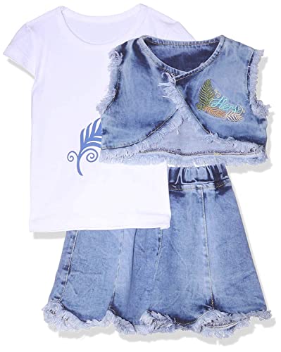 Baby Cadeau - طقم ملابس تيشيرت بأكمام قصيرة على الكتف بطبعة ريشة وجيبة بأطراف شراشيب مع فيست للبنات من بيبي كادو - ابيض وجينز، 3 قطع، 24 - 36 شهر