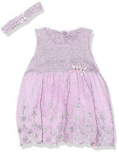 Baby Cadeau - فستان قطن بدون اكمام بنقشة مربعات صغيرة وورود مخيطة مع باندانا للبنات من بيبي كادو - بينك وابيض، 6 - 9 شهور، متعدد الألوان