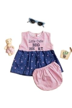 Generic - Baby Girl Summer Dress Set, Pink Striped Top with Navy Heart Pattern Skirt, Matching Bloomers, 2 Piece Outfit