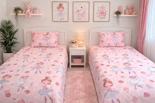 Generic - طقم ملايات أطفال بناتي فلات، 6 قطع لسريرين، قطن عامرية معالج ضد الوبرة، تصميم باليرينا وردي، يشمل ملاءتين ومخدتين وخداديتين، ارتفاع 30 سم