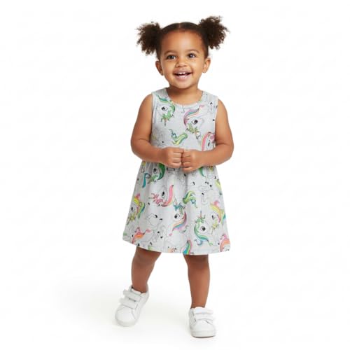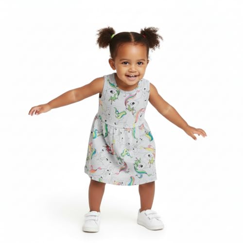 Generic - فستان أطفال بناتي مطبوع بنقشة يونيكورن قطني، رمادي فاتح، تصميم كاجوال بدون أكمام