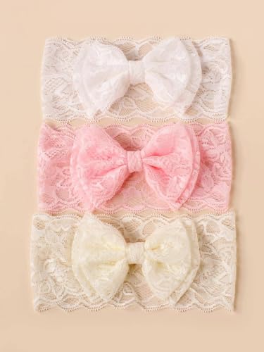 Generic - عصابة رأس دانتيل للأطفال مع فيونكة كبيرة، طقم ٣ قطع، أبيض وزهري وكريمي